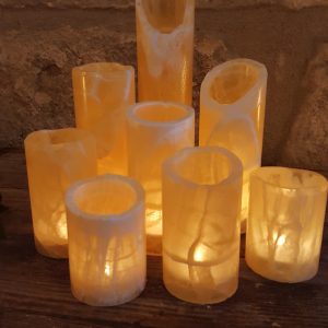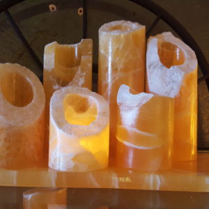 Candle covers (cylinders) are open ended on the bottom so they can be set over any light source. They can all be lit with standard tea light candles, LED’s, or electric lights. They are priced by height and diameter. Patterns and tops will vary. The 4″ and 5″ diameter stones will double as wine chillers. Use the candle covers alone or on any candle holder or wall sconce.