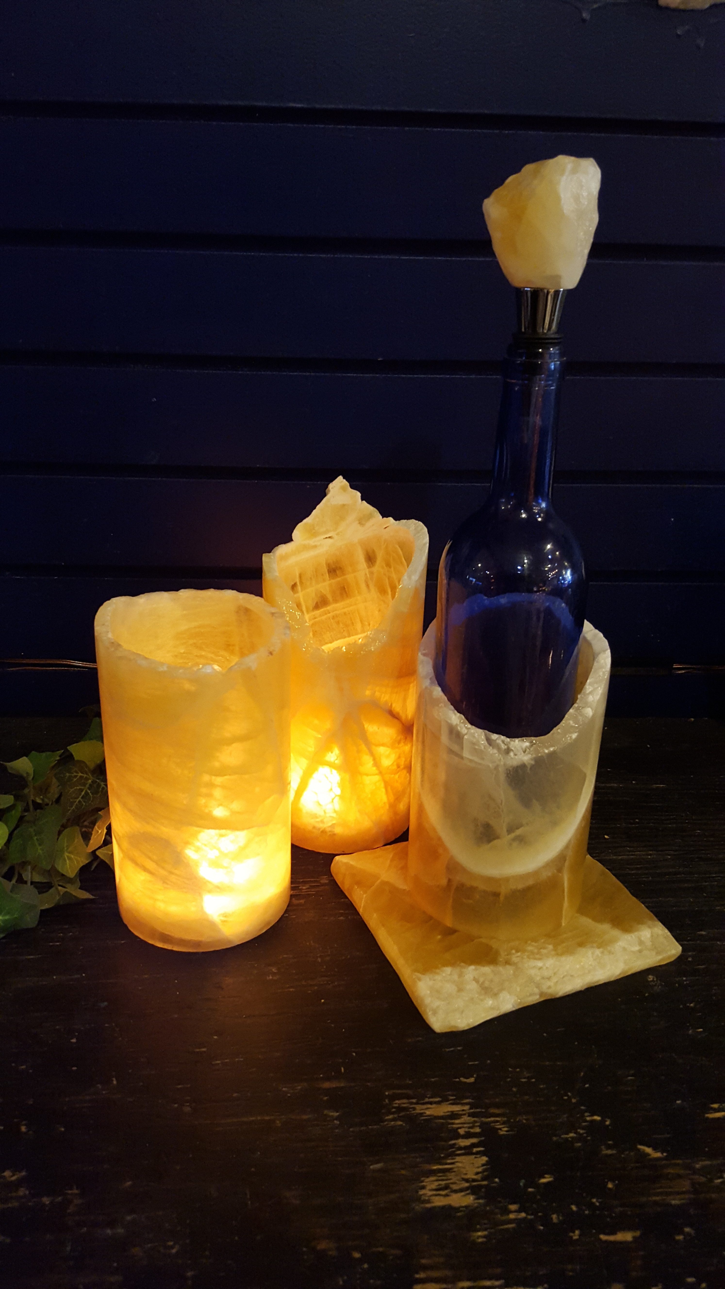 Honeycomb calcite is a natural stone and makes a great wine chiller because it will hold temperature. Just put the cylinder in the refrigerator or freezer and it will keep your wine chilled at the table! When not using it for wine light it up with candles and enjoy!!