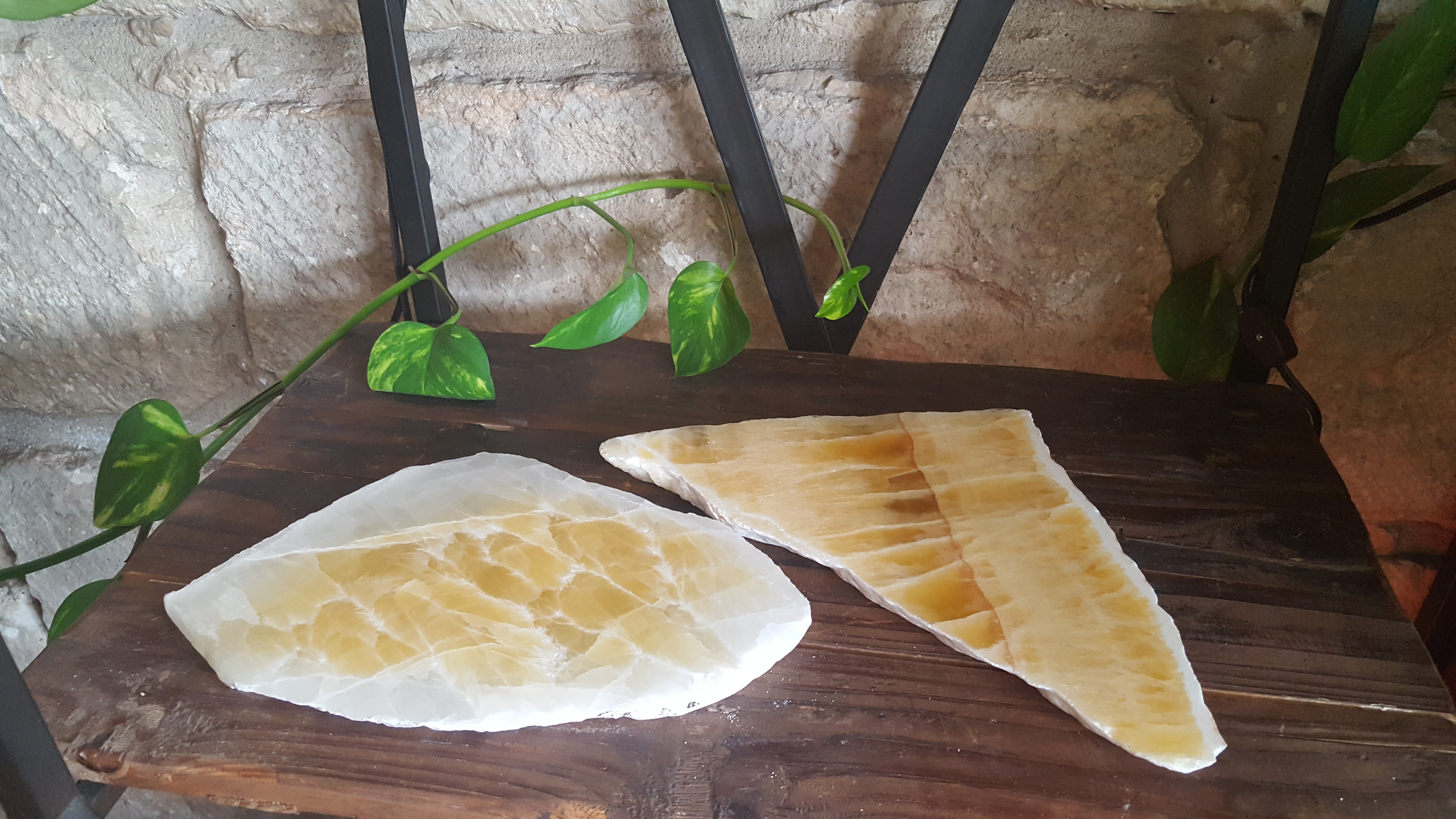 Shapes, patterns, and color of slabs will vary but this size is greatĀ for 5″ and 6″ diameter cylinders, or multiple 2″ and 3″ diameter cylinders. Shown with 6″ honeycomb calcite cylinder. Also great serving pieces for cheese, fruit, or sushi. Approximate size is 8″-10″ x 6″-8″.